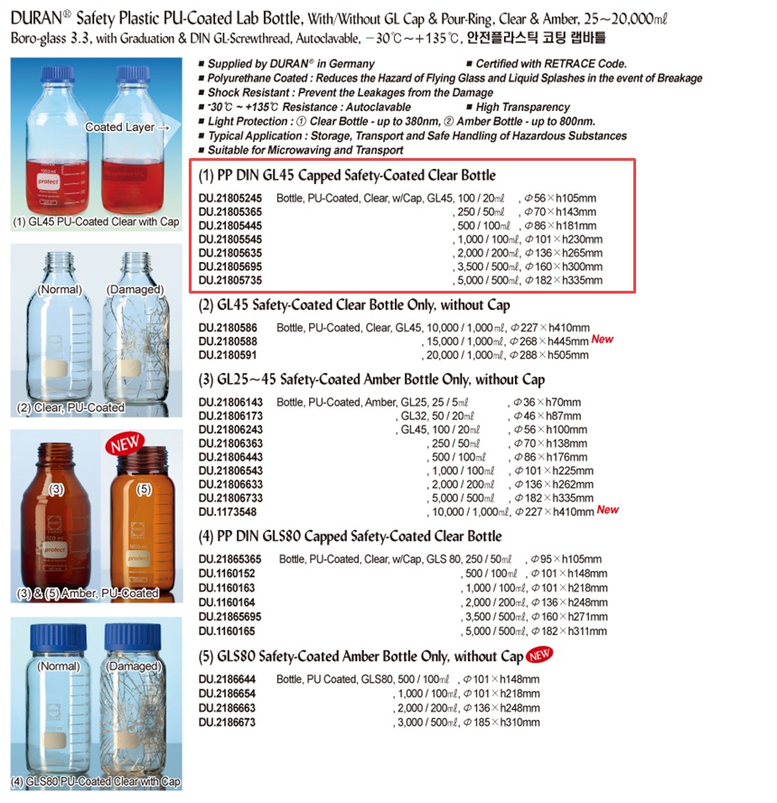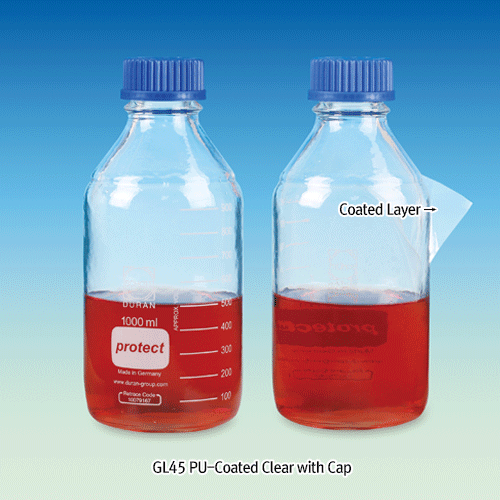 DURAN® Safety Plastic PU-Coated Lab Bottle, With/Without GL Cap & Pour-Ring, Clear & Amber, 25~20,000㎖Boro-glass 3.3, with Graduation & DIN GL-Screwthread, Autoclavable, -30℃~+135℃, 안전플라스틱 코팅 랩바틀