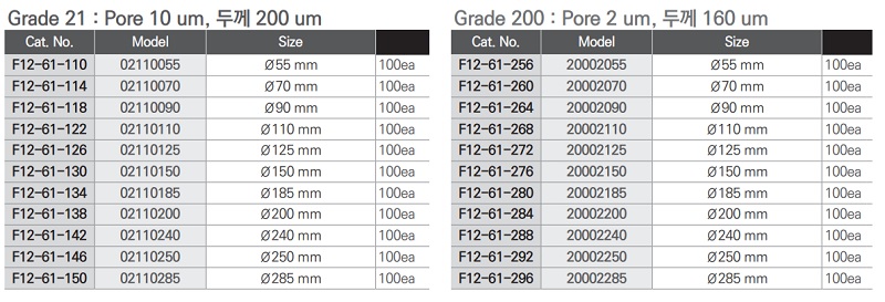 Grade 21 : Pore 8 ~ 12 um, 두께 200 umGrade 200 : Pore 2 ~ 3 um, 두께 160 um