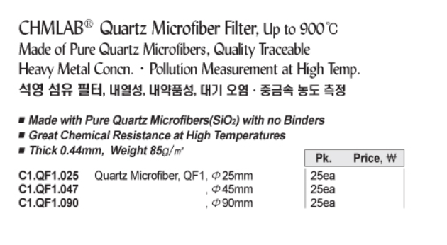 CHMLAB® Quartz Microfiber Filter, Up to 900℃Made of Pure Quartz Microfibers, Quality TraceableHeavy Metal Concn.·Pollution Measurement at High Temp.석영 섬유 필터, 내열성, 내약품성, 대기 오염·중금속 농도 측정