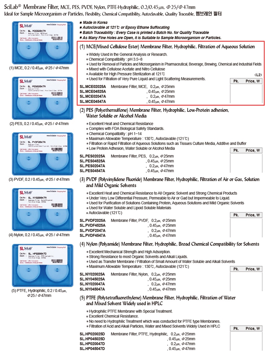 SciLab® Membrane Filter, MCE, PES, PVDF, Nylon, PTFE-Hydrophilic, 0.2/0.45㎛, Φ25/Φ47mmIdeal for Sample Microorganism or Particles, Flexibility, Chemical Compatibility, Autoclavable, Quality Traceable, 멤브레인 필터