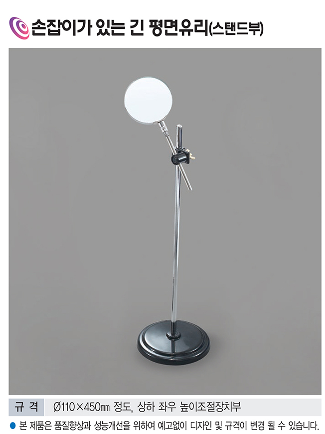 품명 스탠드형 평면유리 관찰 미러로 작업대·실험대 점검에 활용됩니다. Ø110mm 평면유리와 높이·각도 조절 기능으로 정밀한 관찰과 점검 작업에 적합한 스탠드 미러입니다.