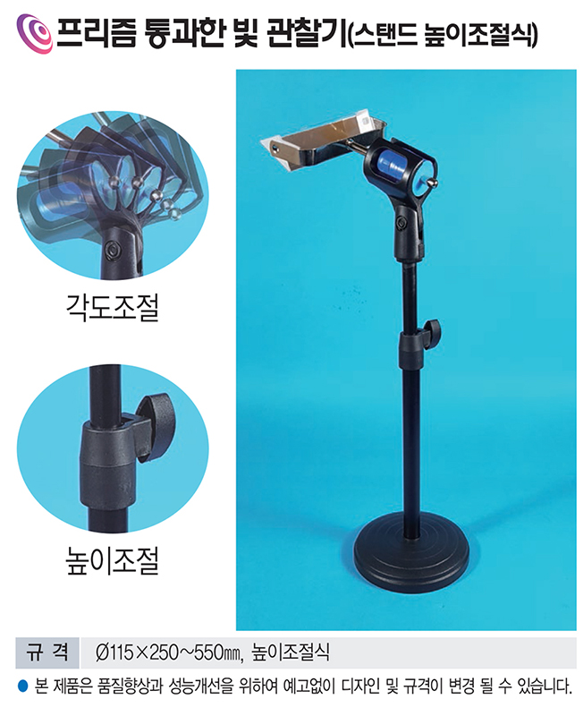 품명 프리즘을 통과한 빛의 굴절·분산을 관찰하는 실험용 스탠드 장비로, 높이·각도 조절이 가능하며 Ø115 베이스와 250~550mm 조절 범위로 물리·광학 실험에 활용하기 좋은 관찰기입니다.