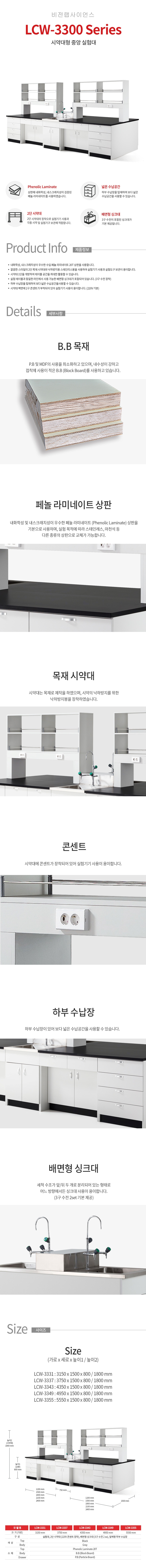 목재 재질 시약대형 중앙실험대(중앙 싱크대 포함) LCW-3331