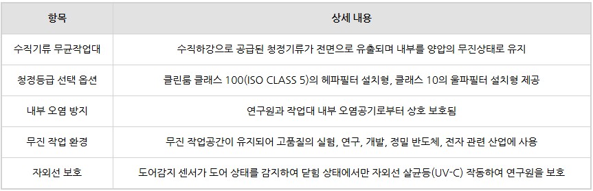 생물학적 실험 및 무균 공정 작업 환경에 적합합니다.