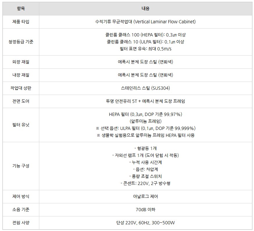 품명 HEPA 필터로 99.97% 이상 포집! ISO5급 청정도 유지, 수직기류 무균작업대로 안전한 실험 환경 구축