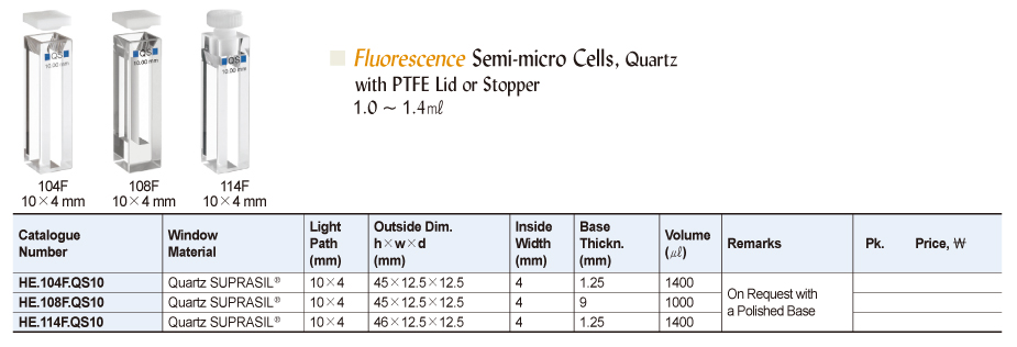 Fluorescence Semi-micro Cells, Quartzwith PTFE Lid or Stopper1.0 ~ 1.4㎖