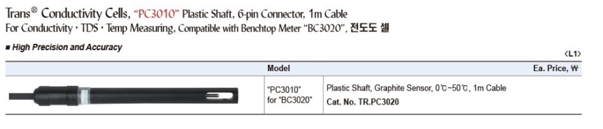 트랜스 전도성 셀, "PC3010" 플라스틱 샤프트, 6핀 커넥터, 전도성을 위한 1m 케이블. TDS 온도 측정, 벤치탑 미터 "BC3020"과 호환 가능.