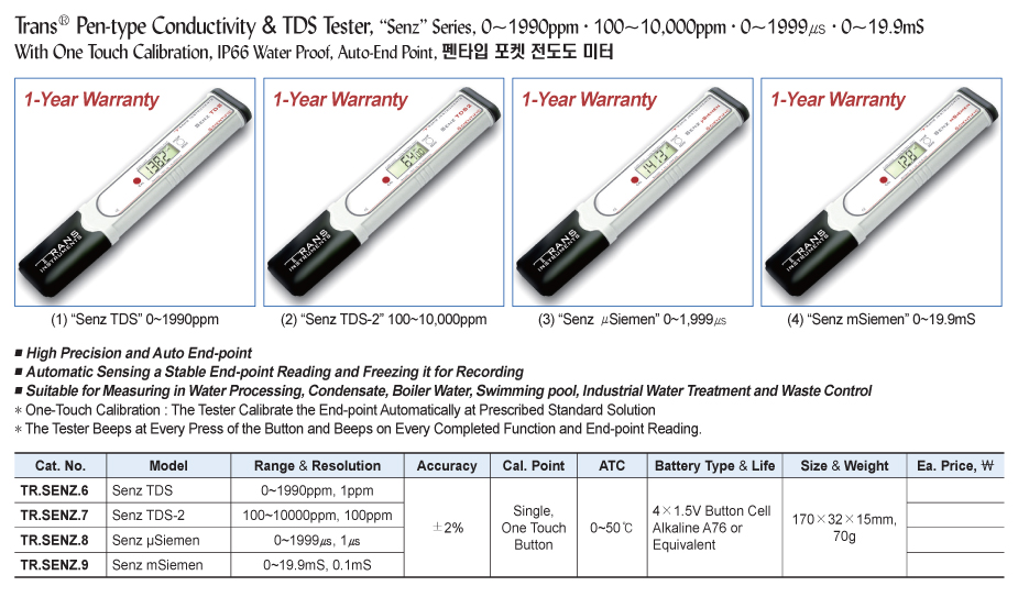 Trans® Pen-type Conductivity & TDS Tester, “Senz” Series, 0~1990ppm·100~10,000ppm·0~1999㎲·0~19.9mSWith One Touch Calibration, IP66 Water Proof, Auto-End Point