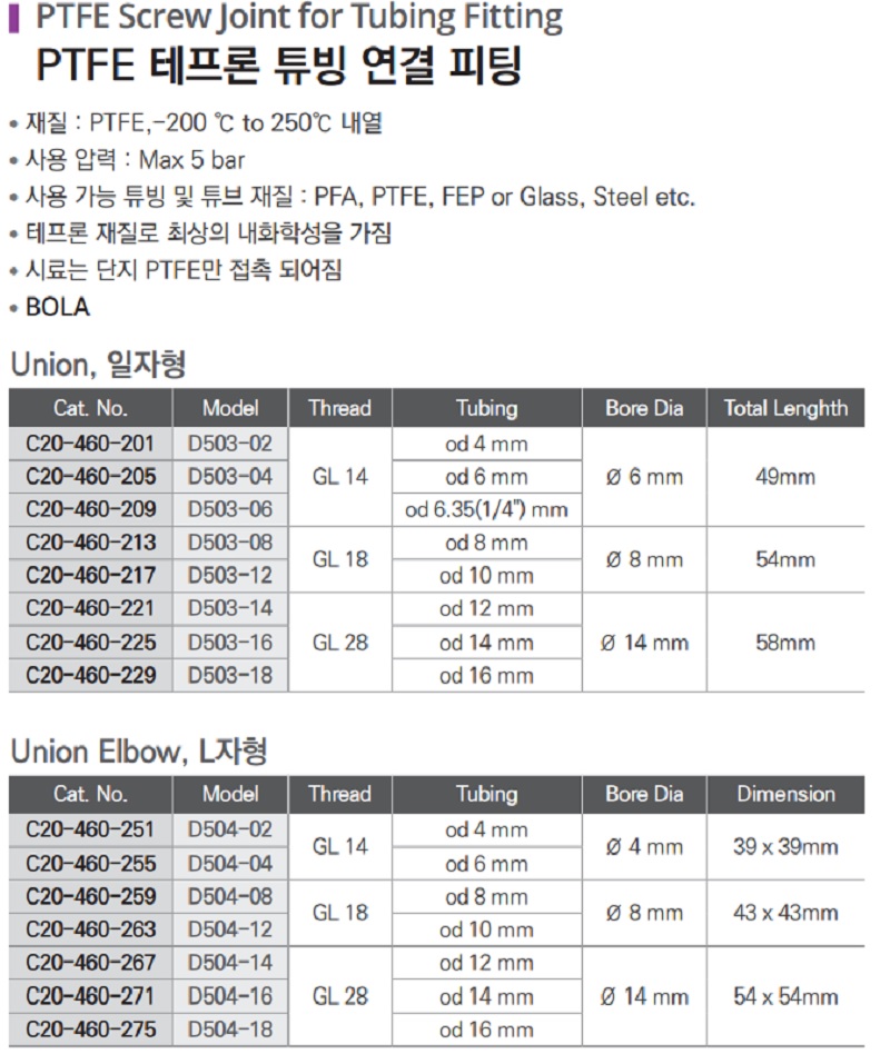PTFE 테프론 튜빙 연결 피팅