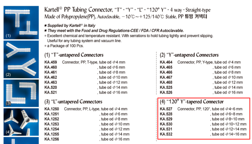 Kartell® PP Tubing Connector, “T”·“Y”·“L”·“120° Y”·4 way·Straight-typeMade of Polypropylene(PP), Autoclavable, -10℃~+125/140℃ Stable, PP 튜빙 커넥터