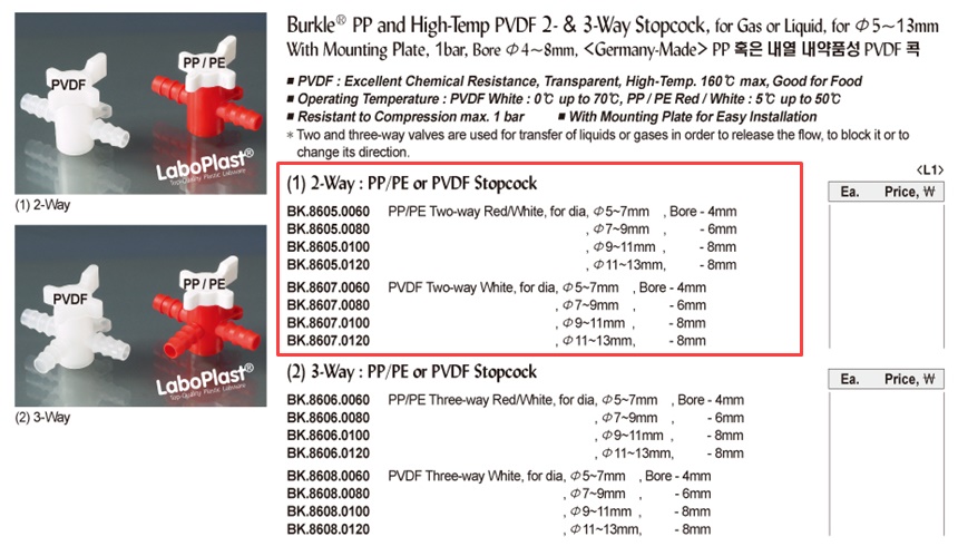 품명 PP 혹은 내열 내약품성 PVDF 콕