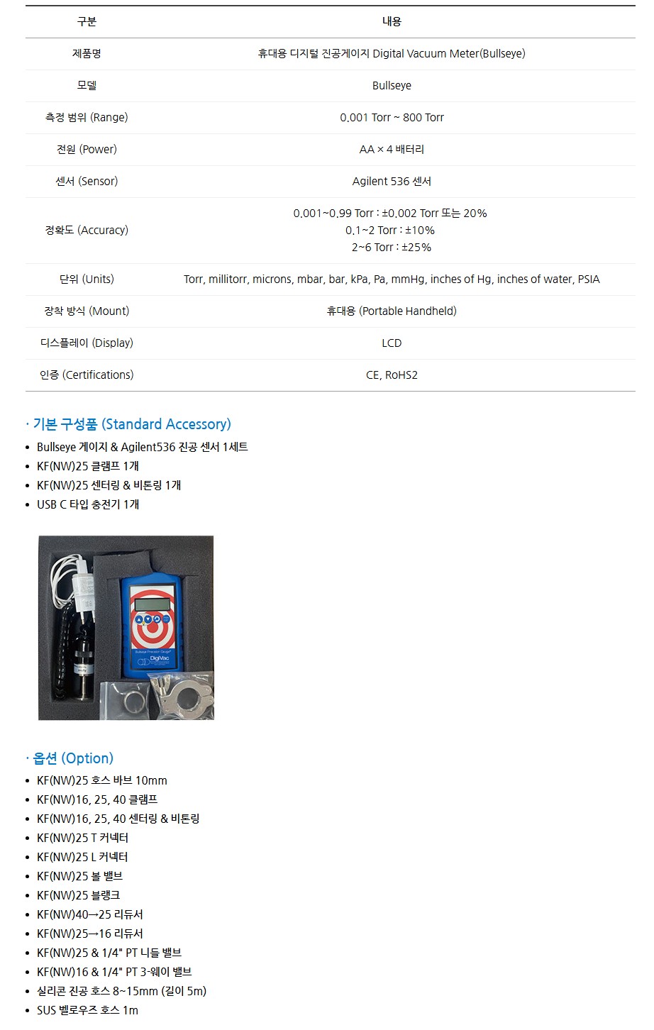 품명 휴대용 디지털 진공게이지 Bullseye, Agilent 536 센서 탑재로 정밀한 측정과 다양한 단위 표시가 가능한 연구·산업용 진공계.