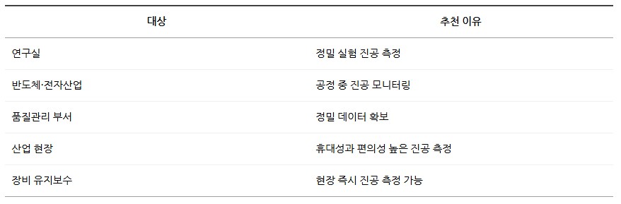그래프 모드와 문자 모드로 손쉽게 진공 상태를 확인할 수 있어 연구실, 산업현장, 품질관리 부서에서 활용도가 높습니다.