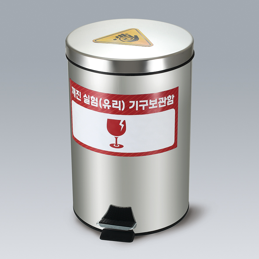 개요: 과학실에서 발생하는 파손된 비커 등을 보관합니다. 발로 페달을 누르면 뚜껑이 열리는 원터치 방식이며, 안에 내부 통이 별도로 있어 처리가 용이합니다.