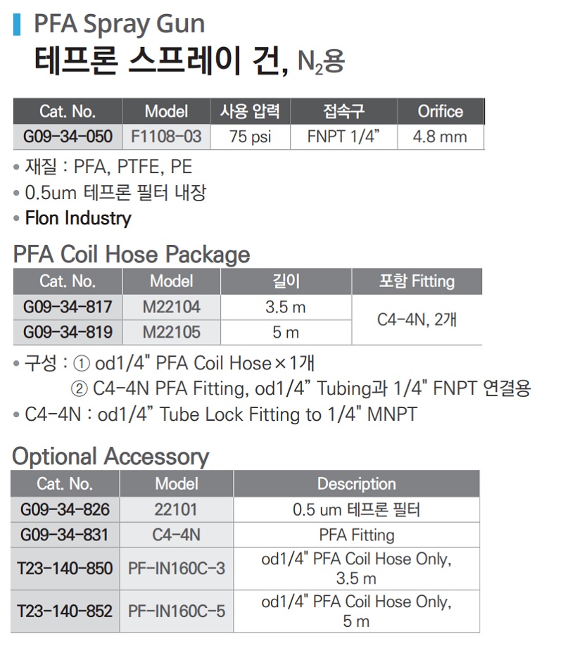 품명 ■ 재질 : PFA, PTFE, PE ■ 0.5um 테프론 필터 내장 ■ Flon Industry