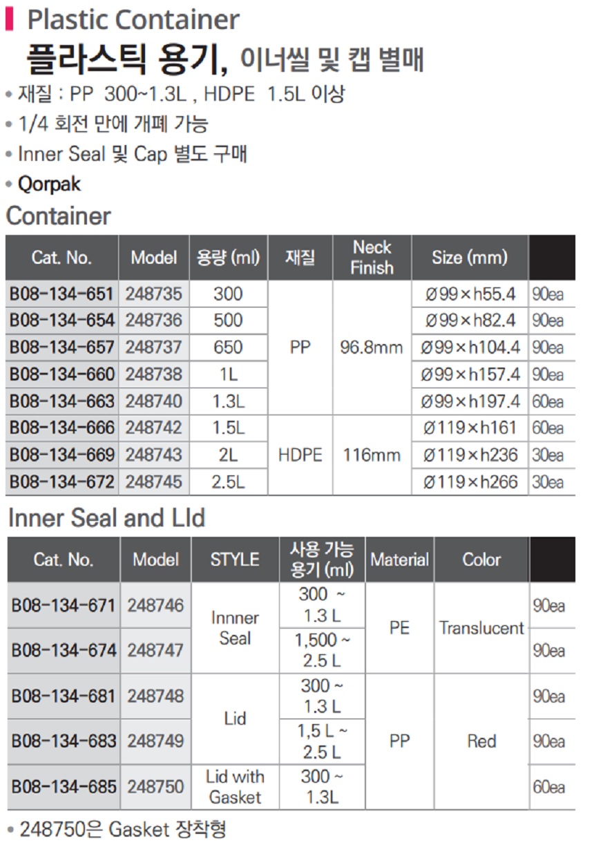 플라스틱 용기, 이너씰 및 캡 별매 Plastic Container, B08-134-651
