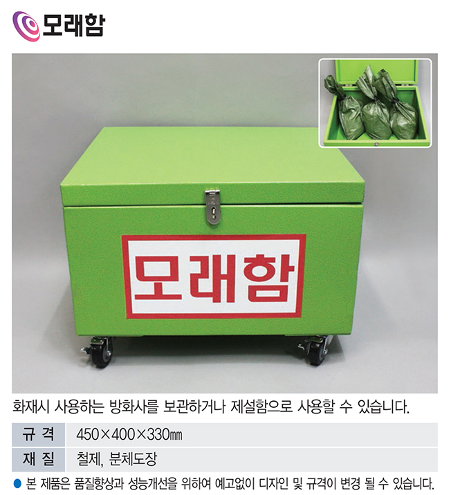 품명 철제 분체도장 모래함은 방화사 또는 제설용 모래를 안전하게 보관할 수 있는 이동식 보관함입니다. 내식성과 내구성이 뛰어나 실외 설치에 적합하며 뚜껑 잠금장치와 이동 바퀴로 사용 편의성이 우수한 방재·제설 겸용 모래함입니다.