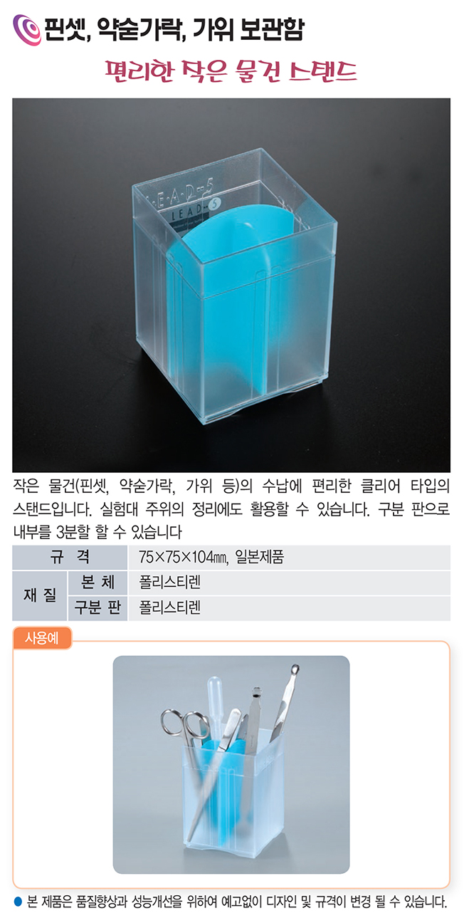 핀셋·약숟가락·가위 등 작은 실험 도구를 깔끔하게 보관할 수 있는 클리어 타입의 스탠드입니다.