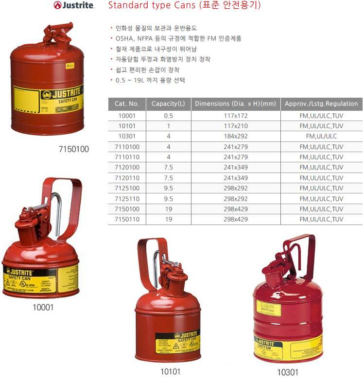 품명 인화성 물질의 보관과 운반용도 OSHA, NFPA 등의 규정에 적합한 FM 인증제품 철제 제품으로 내구성이 뛰어남 자동닫힘 뚜껑과 화염방지 장치 장착 쉽고 편리한 손잡이 장착 0.5 ~ 19L 까지 용량 선택