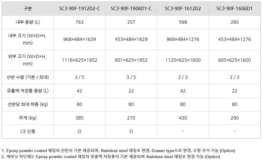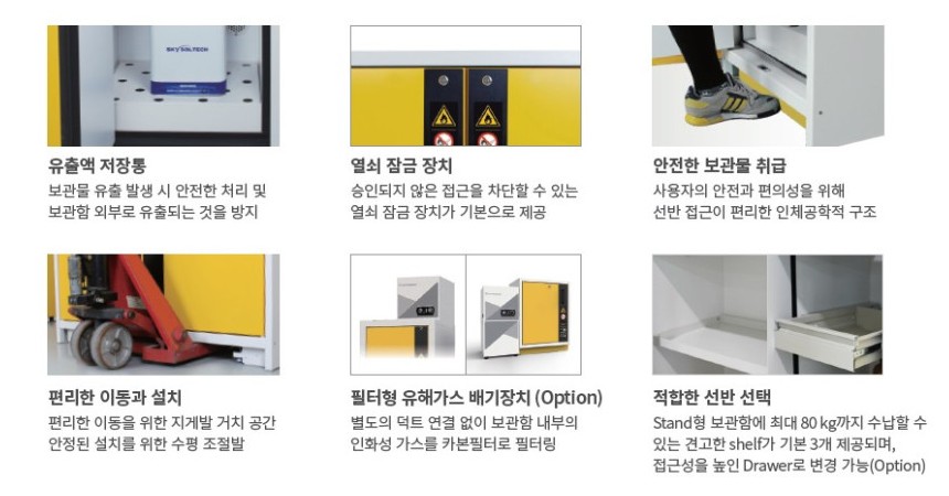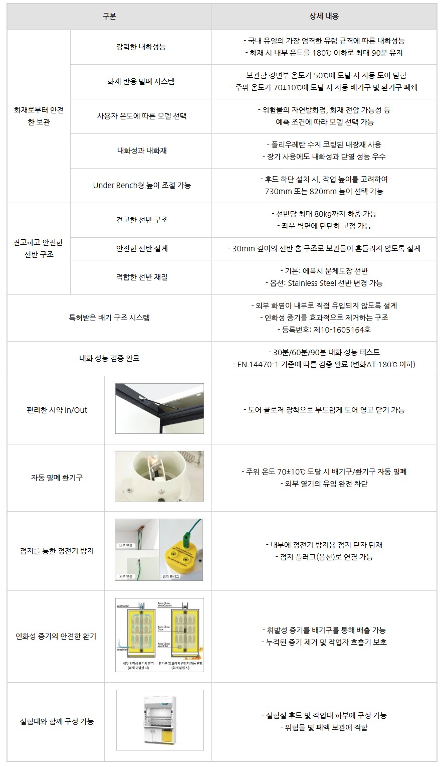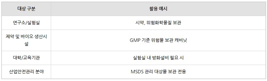 인화성 위험물 보관함, 산/염기 시약장, 일반 시약장 시리즈, 소형 흄후드 등에 적용