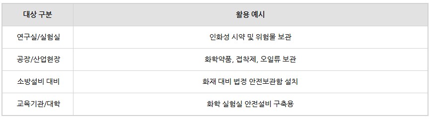 인화성 위험물 보관함, 산/염기 시약장, 일반 시약장 시리즈, 소형 흄후드 등에 적용