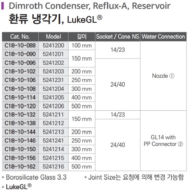 품명 ■ Borosilicate Glass 3.3 ■ Joint Size는 요청에 의해 변경 가능함