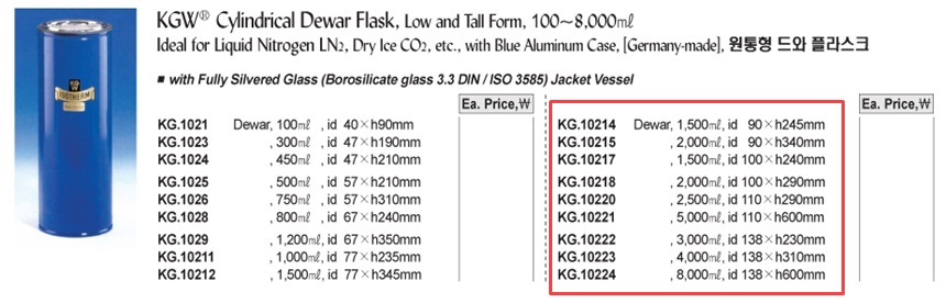KGW® Cylindrical Dewar Flask, Low and Tall Form, 1 00~8,000㎖Ideal for Liquid Nitrogen LN 2 , Dry Ice CO 2 , etc., with Blue Aluminum Case, [ Germany-made ] , 원통형 드와 플라스크