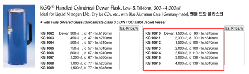 KGW® Handled Cylindrical Dewar Flask, Low- & Tall-form, 300~4,000㎖Ideal for Liquid Nitrogen LN 2 , Dry Ice CO 2 , etc., with Blue Aluminum Case, [ Germany-made ] , 핸들 드와 플라스크