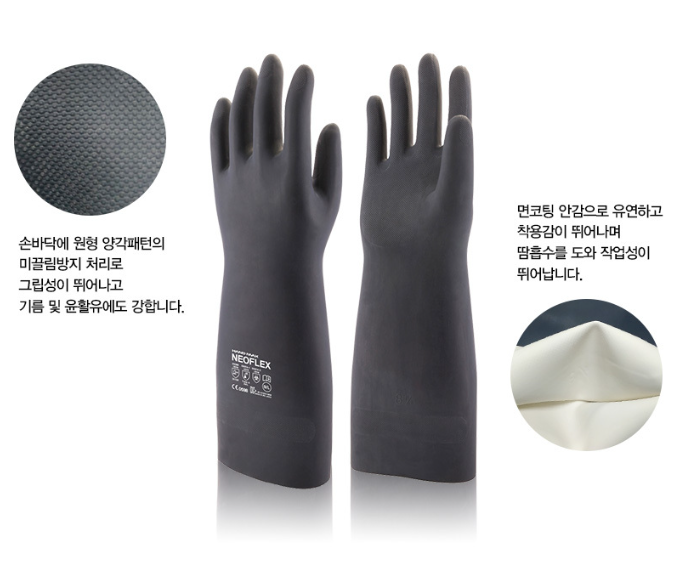 ■네오프렌 재질로 우수한 강도 및 내화학성은 물론 안감에 면코팅 처리가 되어 착용감이 뛰어나며 땀흡수에도 용이합니다.