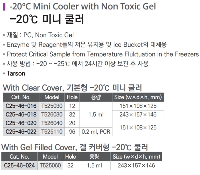 품명 ■ 재질 : PC, Non Toxic Gel ■ Enzyme 및 Reagent들의 저온 유지용, Ice Bucket의 대체용으로 알맞음 ■ Protect Critical Sample from Temperature Fluktuation in the Freezers ■ 사용방법 : -20 ~ -25℃ 에서 24시간 이상 보관후 사용 ■ Tarsons