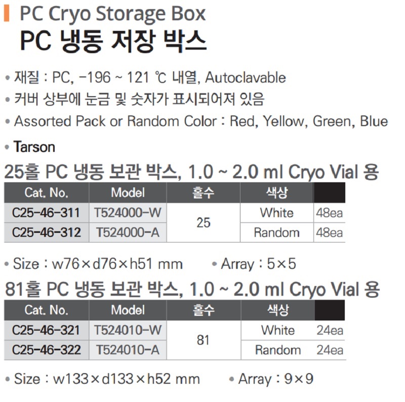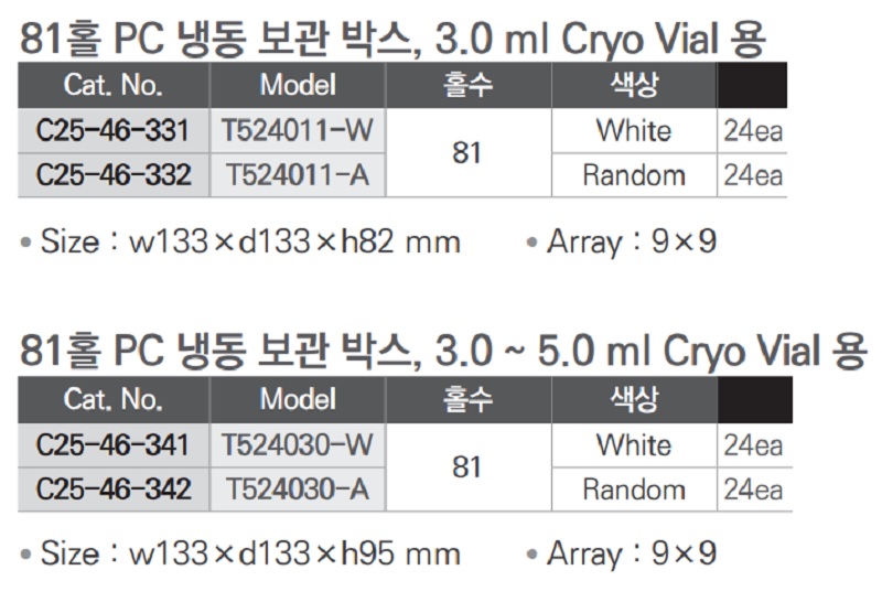 81홀 PC 냉동 보관 박스, 3.0 ~ 5.0 ml Cryo Vial 용| Cat. No | Model | 홀 수 | 색상 |