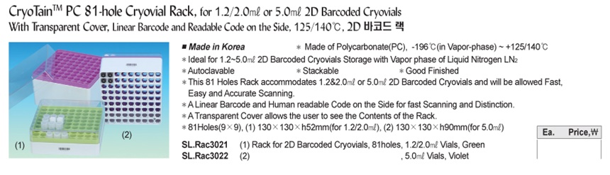 CryoTain TM PC 81-hole Cryovial Rack, for 1.2/2.0㎖ or 5.0㎖ 2D Barcoded CryovialsWith Transparent Cover, Linear Barcode and Readable Code on the Side, 125/140℃, 2D 바코드 랙