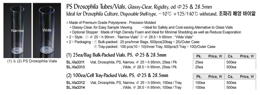 PS Drosophila Tubes/Vials, Glassy-Clear, Rigidity, od Φ25 & 28.5mmIdeal for Drosophila Culture, Disposable Shell-type, -10℃ +125/140℃ withstand, 초파리 배양 바이알