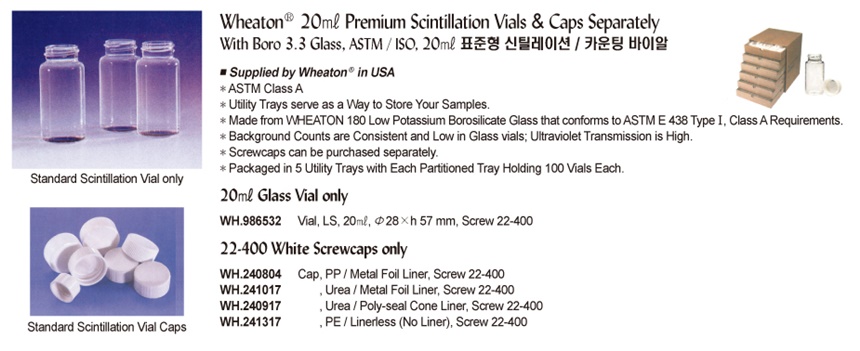 Wheaton® 20㎖ Premium Scintillation Vials & Caps SeparatelyWith Boro 3.3 Glass, ASTM / ISO, 20㎖ 표준형 신틸레이션 / 카운팅 바이알