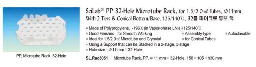SciLab® PP 32-Hole Microtube Rack, for 1.5/2.0㎖ tubes, Φ11mmWith 2 Tiers & Conical Bottom/Base, 125/140℃, 32홀 마이크로 튜브 랙