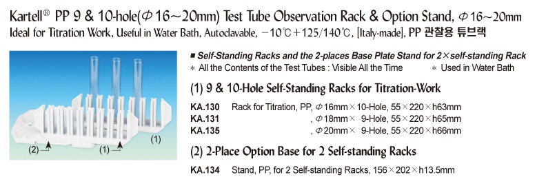 Kartell® PP 9 & 10-hole(Φ16~20mm) Test Tube Observation Rack & Option Stand, Φ16~20mmIdeal for Titration Work, Useful in Water Bath, Autoclavable, -10℃+125/140℃, [ Italy-made ] , PP 관찰용 튜브랙