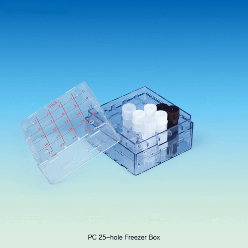 SciLab® PC 25-hole Freezer Box, for 1~2㎖ Cryovials/TubesWith Lid & 1-25 Numeric-index/Φ12.3mm, Stackable, -130℃+125℃, 25홀 프리저 박스