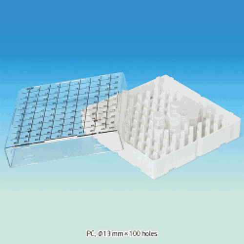 SciLab® PC 100-hole Freezer Box, for 1~2㎖ Cryovials/Tubes, with Post-style DividerWith Lid & 1-100 Numbered-holes/Φ13mm, Stackable, -130℃+125℃, 100홀 프리저 박스