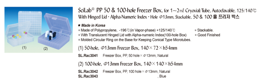 SciLab® PP 50 & 100-hole Freezer Box, for 1~2㎖ Cryovial/Tube, Autoclavable, 125/140℃With Hinged Lid·Alpha-Numeric Index·Hole Φ13mm, Stackable, 50 & 100 홀 프리저 박스