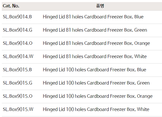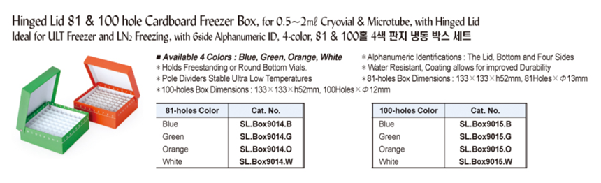 Hinged Lid 81 & 100 hole Cardboard Freezer Box, for 0.5~2㎖ Cryovial & Microtube, with Hinged LidIdeal for ULT Freezer and LN2 Freezing, with 6side Alphanumeric ID, 4-color, 81 & 100홀 4색 판지 냉동 박스 세트
