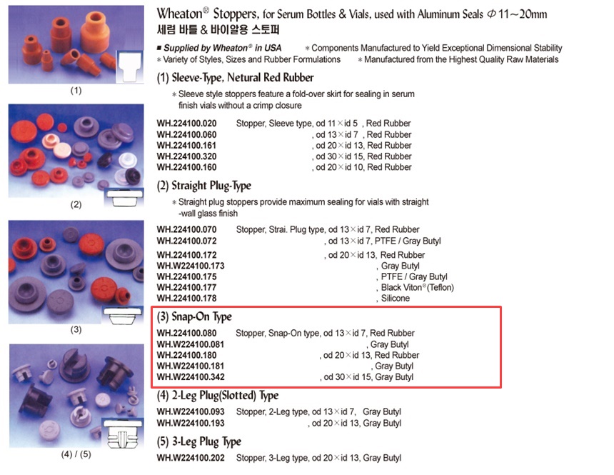 Wheaton® Stoppers, for Serum Bottles & Vials, used with Aluminum Seals Φ11~20mm세럼 바틀 & 바이알용 스토퍼