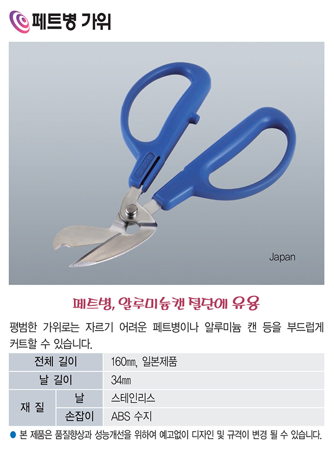 품명 페트병과 알루미늄 캔을 쉽게 절단할 수 있는 일본산 페트병 가위입니다. 스테인리스 날과 ABS 손잡이로 내구성과 사용감을 높였으며 재활용 작업 및 일상 컷팅 작업에 매우 유용합니다.