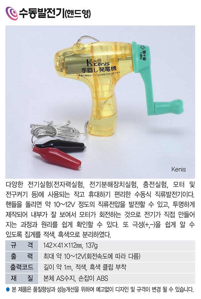 품명 Kenis 수동발전기는 손잡이를 돌려 직접 전기를 생성해보는 교육용 발전기로, 모터 회전과 전기 발생 원리를 쉽게 관찰할 수 있습니다. 10~12V 출력으로 다양한 전기 실험에 활용됩니다.