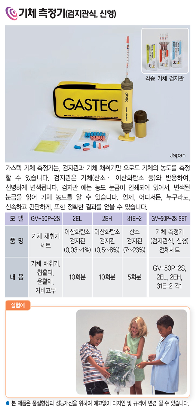 개요 : 검지관과 기체 채취기만으로도 기체의 농도를 측정할 수 있습니다. 검지관은 기체(산소·이산화탄소 등)와 반응하여, 선명하세 변색됩니다. 검지관에는 농도 눈금이 인쇄되어 있어서, 변색된 눈금을 읽어 기체 농도를 알 수 있습니다. 언제, 어디서든, 누구라도, 신속하고 간단하게, 또한 정확한 결과를 얻을 수 있습니다.