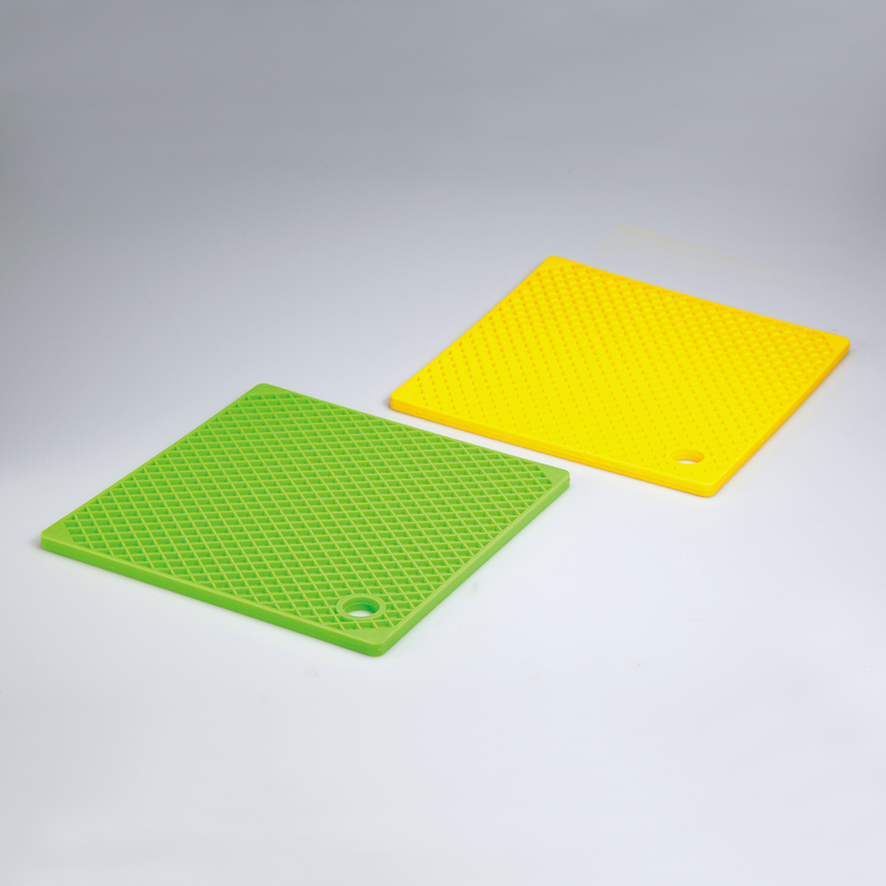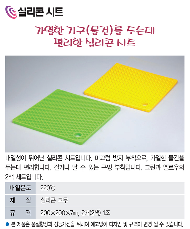 품명 코드번호 : VLS-4366 품명 : 실리콘 시트 개요 : 내열성이 뛰어난 실리콘시트입니다. 미끄럼방지 부착으로, 가열한 물건을 두는데 편리합니다. 걸거나 달 수 있는 구멍 부착입니다. 그린과 옐로우의 2색 세트입니다.
