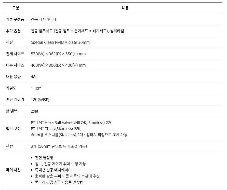 품명 특대형 진공 데시케이터 VW형, 고투명 PMMA 재질로 제작된 48L 대용량 진공 보관함. 맞춤 제작 및 옵션 선택 가능.