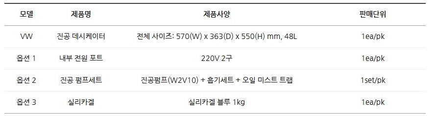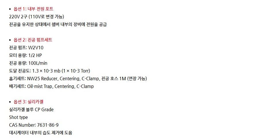 옵션으로 진공 펌프 세트, 실리카겔, 내부 전원 보드를 추가할 수 있어 다양한 실험 조건에 유연하게 대응할 수 있습니다.