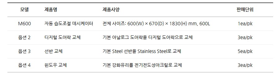 품명 자동 습도조절 데시케이터 M600은 디지털 도어락, 스테인리스 선반, 전기전도성 아크릴 윈도우 등 다양한 옵션 선택이 가능한 600L 대형 항습보관 장비입니다.