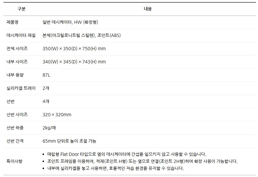 품명 HW 확장형 데시케이터는 87L 대용량과 실리카겔 트레이를 갖춘 건조·저습 보관함으로, 플랫 도어 및 확장 조인트 연결 기능으로 실험실 활용성을 높인 제품입니다.