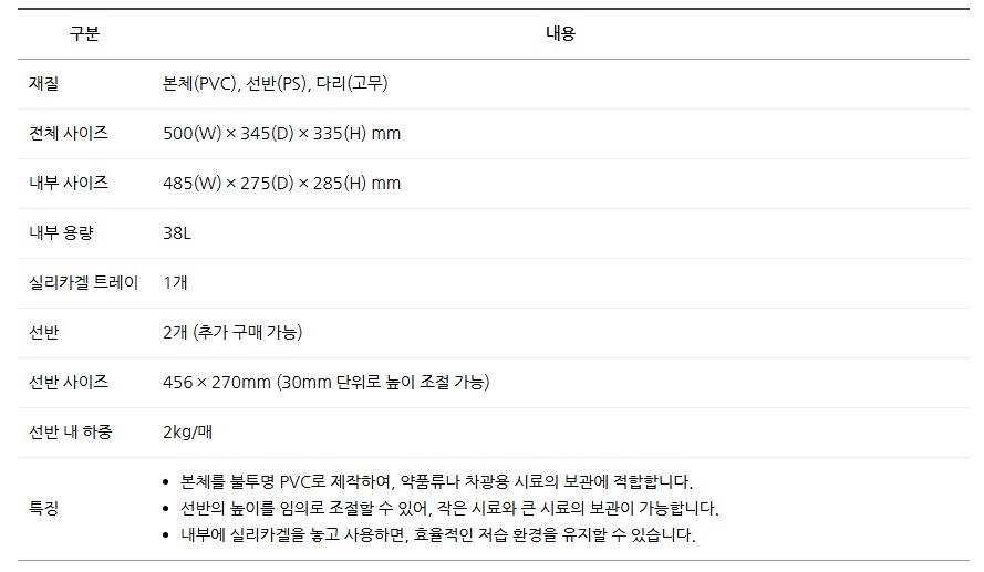 내구성이 뛰어난 PVC 본체와 PS 선반 구성으로 장기간 안정적으로 사용할 수 있는 실용적인 데시케이터입니다.